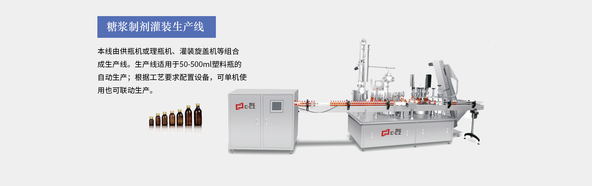 糖漿灌裝生產(chǎn)線(xiàn)適合30ML以上口服液的灌裝生產(chǎn),由供瓶機(jī)、直線(xiàn)式灌裝軋(旋)蓋機(jī)、立式貼標(biāo)機(jī)等設(shè)備組成,可全自動(dòng)完成灌裝、上蓋、旋(軋)蓋、貼標(biāo)等工序。主要用于制藥、食品、化工的的各種液體物料的灌裝聯(lián)動(dòng)生產(chǎn)。本生產(chǎn)線(xiàn)完全符合GMP要求。糖漿灌裝生產(chǎn)線(xiàn)特點(diǎn)裝量特征:無(wú)滴漏、不起泡、不飛濺。運(yùn)行特征:運(yùn)行穩(wěn)定,噪音小;灌裝精確,能耗少,破瓶率低,成品合格率高性能特征:整條生產(chǎn)線(xiàn)可單機(jī)控制和聯(lián)鎖控制。洗瓶...